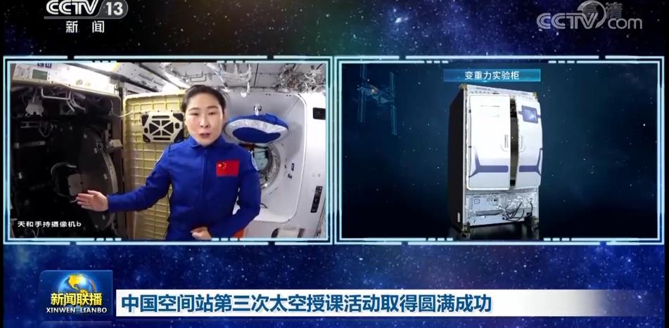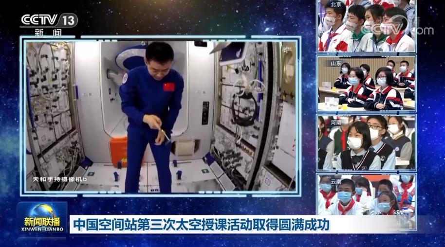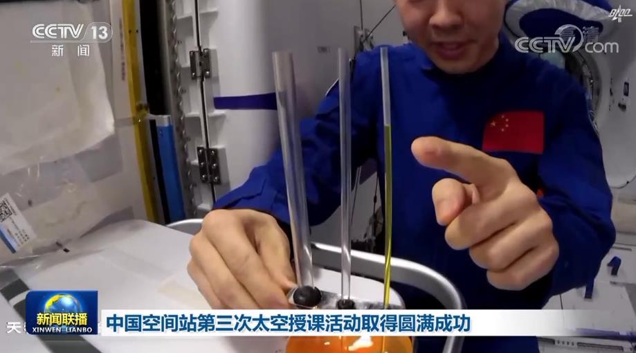 在约50分钟的授课中,神舟十四号飞行乘组生动介绍展示了问天实验舱工作生活场景,演示了微重力环境下毛细效应、水球变“懒”实验、太空趣味饮水、会调头的扳手等神奇现象,讲解了实验背后的科学原理。