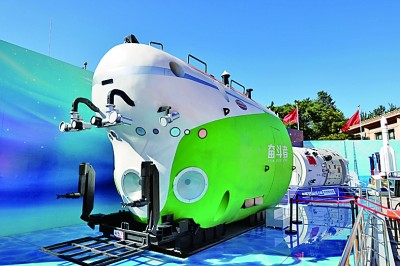 10月11日,北京展览馆“奋进新时代”主题成就展室外展区展示的“奋斗者”号全海深载人潜水器模型。光明网记者 季春红摄/光明图片