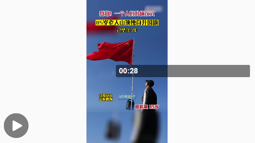 每天,山东威海85岁的田兆亮都会带上国旗,前往村旁的小山举行自己的升旗仪式。如今,村里帮老人焊制了旗杆、购买了音箱,见证升旗仪式的观众也越来越多。老人说:“每当国旗升起来,心情就特别激动,这就是我的家和国啊!”