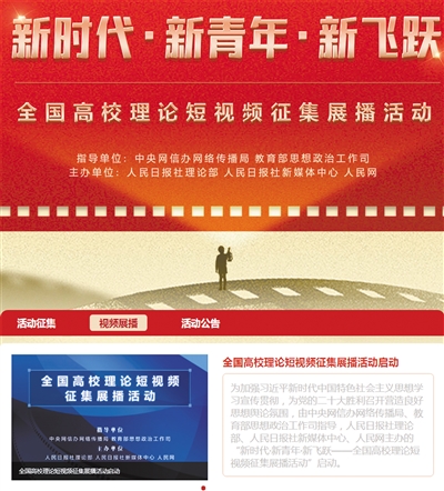为了让党的创新理论进校园、进课堂,人民日报社理论部、新媒体中心、人民网联合举办“新时代·新青年·新飞跃——全国高校理论短视频征集展播活动”。通过征集具有思想创意、理论传播、视觉表达等优势的理论短视频作品进行展播,让理论宣传在青年群体中更接地气、聚人气。