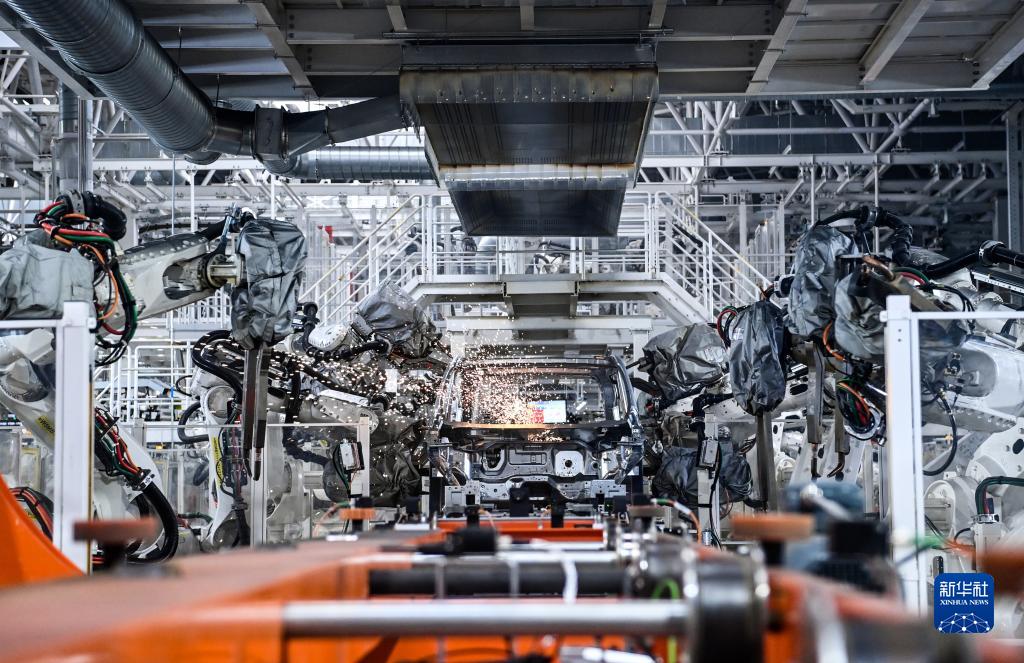 10月17日,在吉林长春中国第一汽车集团有限公司红旗繁荣工厂焊装车间内,焊装机器人在生产线上焊接车身。新华社记者 颜麟蕴 摄