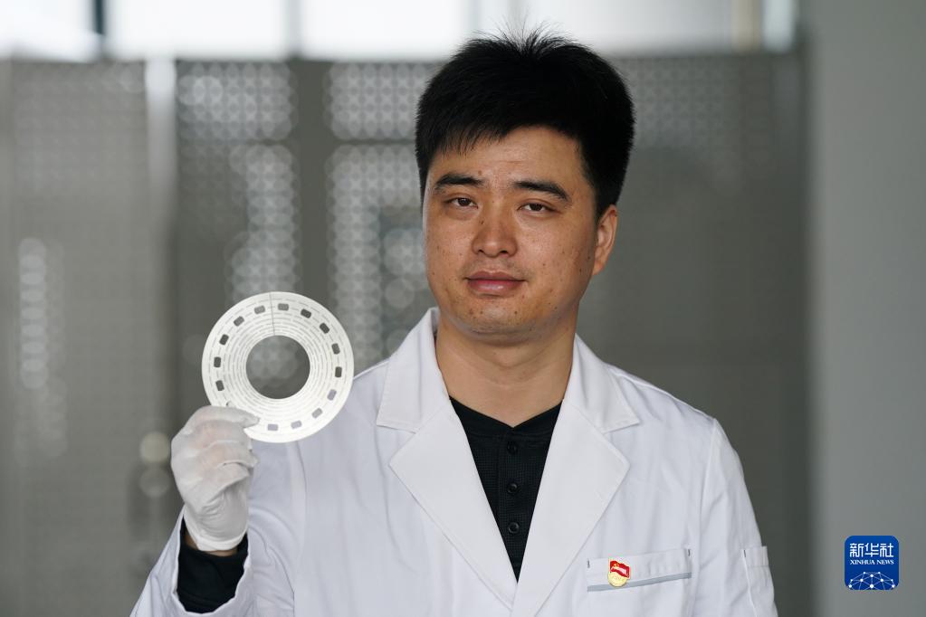 10月17日,在中国科学院合肥物质科学研究院强磁场科学中心,副研究员房震展示水冷磁体线圈的核心组件——比特片。新华社记者 杜宇 摄