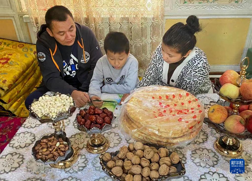 10月16日,新疆喀什古城居民阿依先木姑力·阿布来提(右)在家中辅导孩子功课。新华社发(唐努尔·玉麦尔 摄)