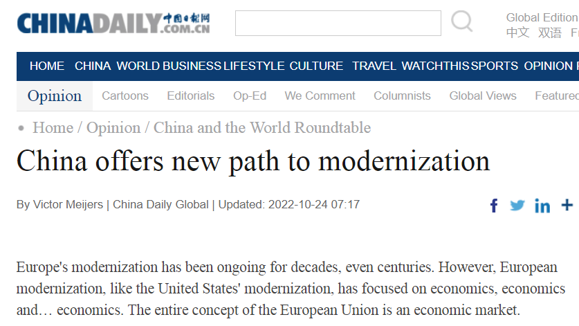 中国日报网10月25日电 中共二十大胜利闭幕后,报告中提到的“中国式现代化”引发广泛热议。荷兰莱顿大学民法学者维克多·梅耶斯在中国日报刊文称,中国式现代化与欧美国家以资本为中心的现代化有着本质区别,能够为世界现代化模式开辟一条新的道路。
