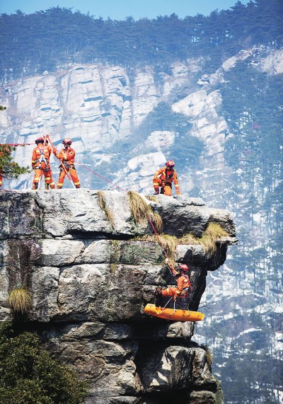 江西庐山风景区消防救援大队在庐山锦绣谷进行救援演练。傅建斌摄/光明图片