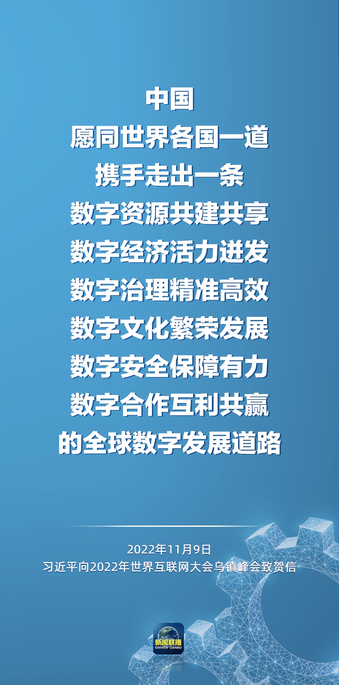 今天(9日),2022年世界互联网大会乌镇峰会在浙江乌镇开幕。习近平主席向峰会致贺信。在贺信中,习主席指出了一条全球数字发展道路,涵盖六个方面:数字资源共建共享、数字经济活力迸发、数字治理精准高效、数字文化繁荣发展、数字安全保障有力、数字合作互利共赢。这条道路,很全面,也很美好。中国愿同世界各国一道,加快构建网络空间命运共同体。