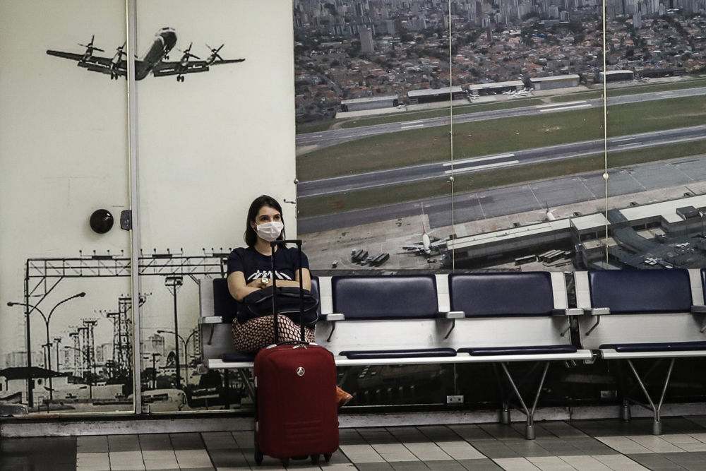 2020年3月16日,一名女子在巴西圣保罗孔戈尼亚斯机场戴口罩出行。