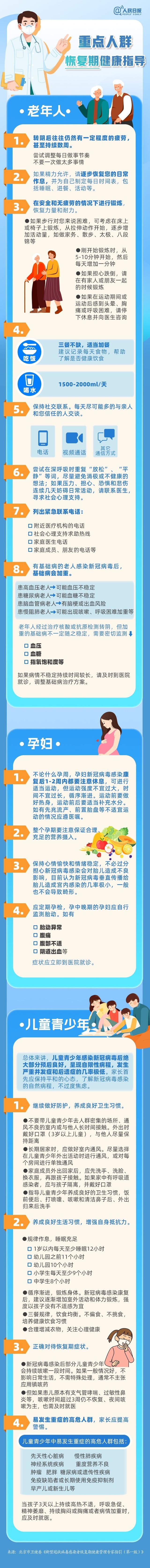 新冠病毒感染恢复期,虽然核酸、抗原检测结果已经转阴,但机体尚未恢复到病前水平,需要1到2周甚至更长时间才能完全缓解。老年人恢复期间需要注意哪些指标?孕妇出现哪些症状应及时就诊?哪些儿童青少年是重症高危人群?一图了解重点人群恢复期健康指导。
