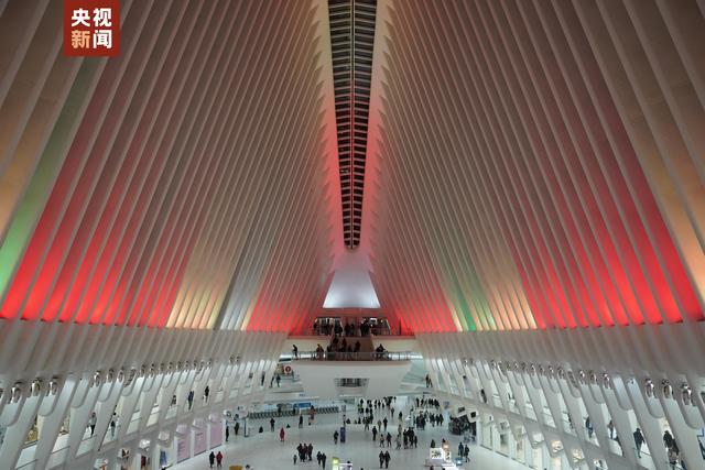 世贸中心车站内通过红黄绿三色投射在骨状屋顶结构上,呈现出喜庆之感。世贸中心一号楼除了楼顶天线被打亮成“中国红”外,底层外屏也反复播放兔年动画,不少游客驻足拍照。