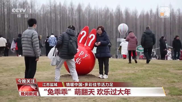 节日期间,江苏盐城东台黄海国家森林公园推出“兔乖乖来林”欢乐过大年主题活动。在“兔”飞猛进的雕塑前,人们跳起欢快的兔子舞;民俗年味小集市上,“非遗”兔年花灯、兔年剪纸、新年糖葫芦、创意棉花糖,让大人小孩流连忘返。