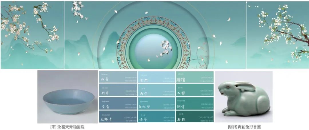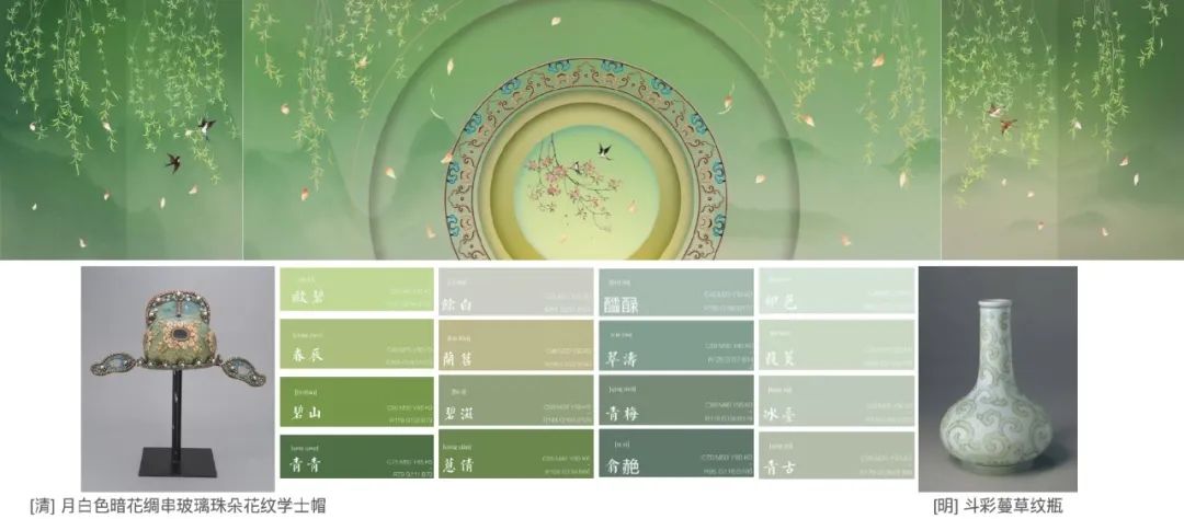 蓝色番中以白玉兰、白梅花和兰花等主要视觉元素象征高洁和典雅,寓意“玉堂富贵”。绿色番视觉则以简洁单纯的柳枝和海棠寓意“春暖花开”。