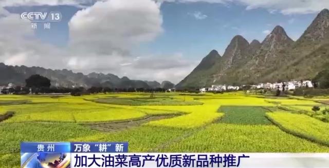 贵州是全国油菜主产区之一,油菜也是全省第四大农作物和最大的油料作物。为了提升油料产能,除了正在增施肥料以外,当地农户们在各个环节都下足了功夫。其实可以发现,在我左右两边的油菜花是不一样的品种,左手边这片是常规的传统油菜品种,它的亩产在60到70公斤,而右手这边的油菜则是今年推广的杂交新品种,它的特点是开花早、花期长、成熟得早,另外它最大的特点是产量高,它的结荚数也要比传统品种多好多。它的亩产量最大可达120公斤左右,比传统的油菜品种多出50公斤。今年在黔西南州这种新品种的推广率已经达到了76.3%。