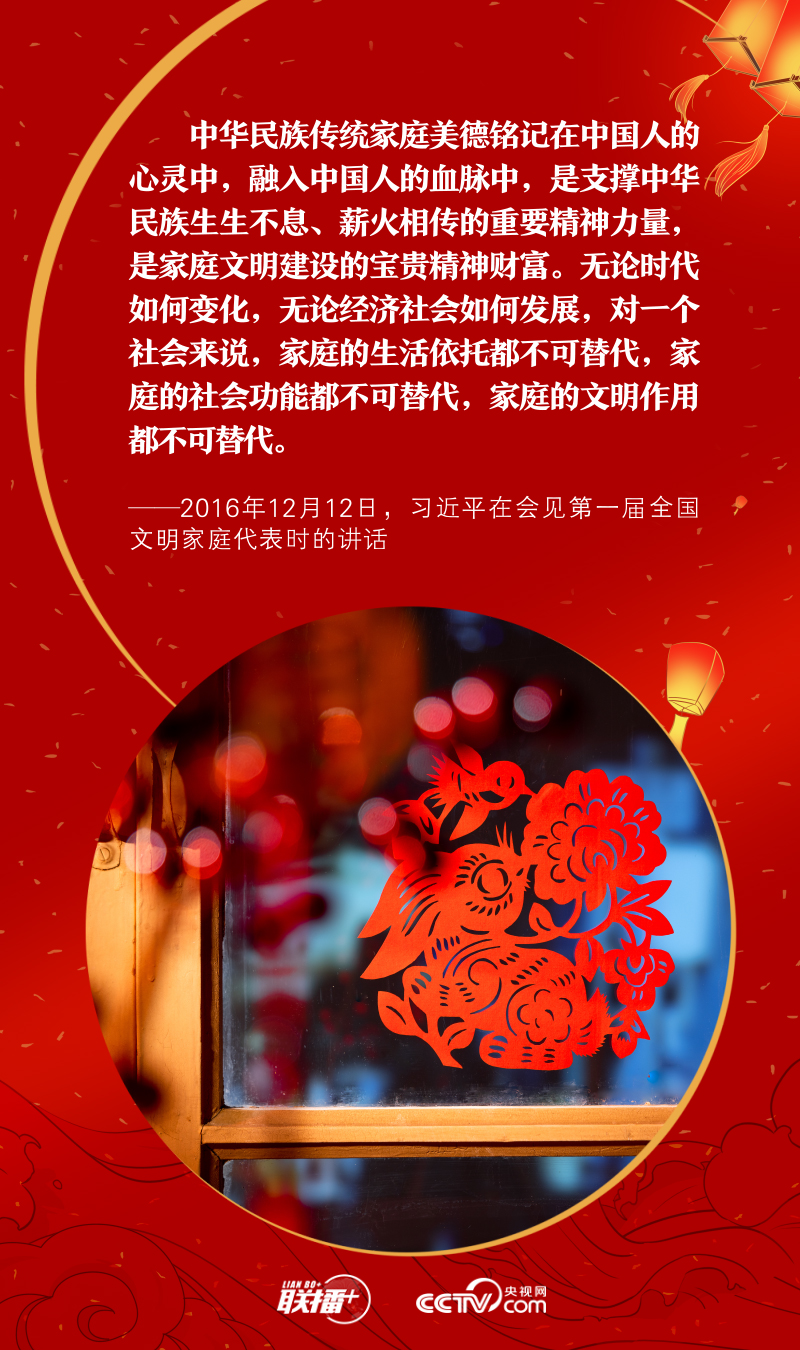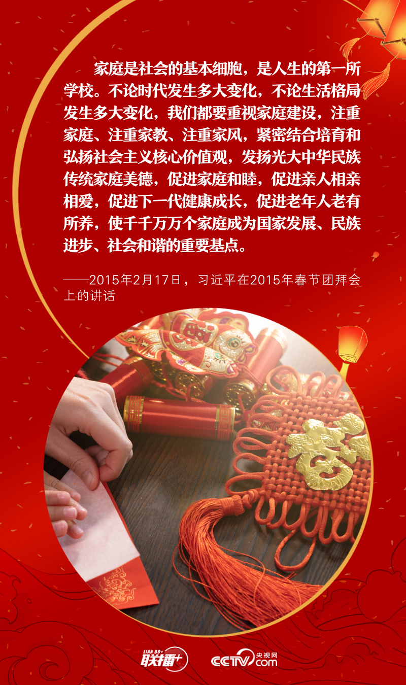 联播+天下之本在国,国之本在家。元宵佳节既是万家团圆、共话美好的日子,也是爱国爱家同频、家国情怀共融的时刻。党的十八大以来,习近平总书记在讲话中多次提到了家庭、家教、家风,深刻阐述了家庭与社会、家庭与国家之间的关系。央视网《联播+》特推出海报,与您一起感悟总书记的家国情怀。