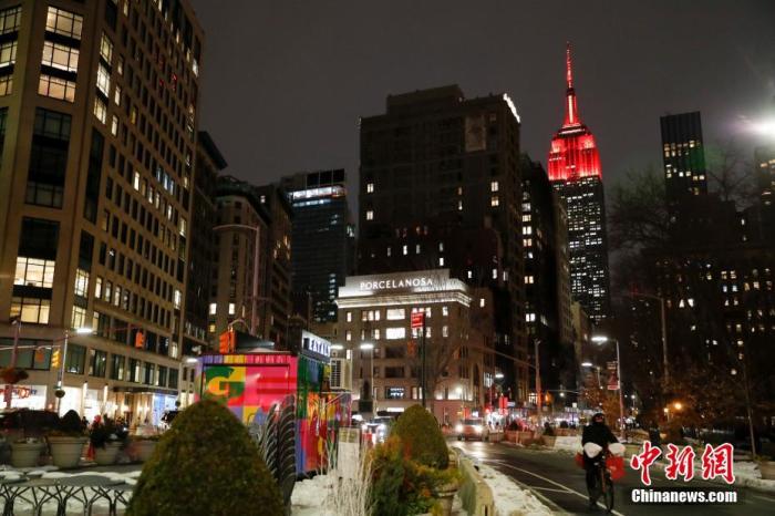 资料图:当地时间2021年2月10日,美国纽约帝国大厦为中国春节点亮红色灯光。 中新社记者 廖攀 摄