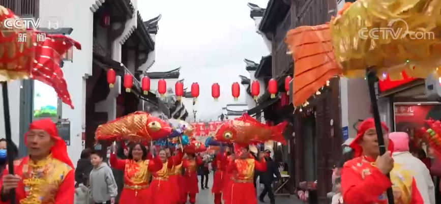 游客 洪燕菲:感觉这里很有韵味,看到张灯结彩的鲜红的灯笼挂着,还有这边的青石板路、白墙青瓦以及独具地方特色的民俗文艺演出,让我深切体验到了江南古镇的新年烟火味儿。