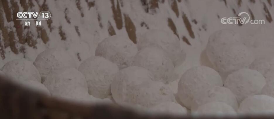 屋里正做的就是手摇元宵,这种元宵就是把一个方方正正的馅,沾水放到糯米粉里摇一摇,就变成圆滚滚的大元宵,一碗热气腾腾的元宵寓意着团团圆圆。