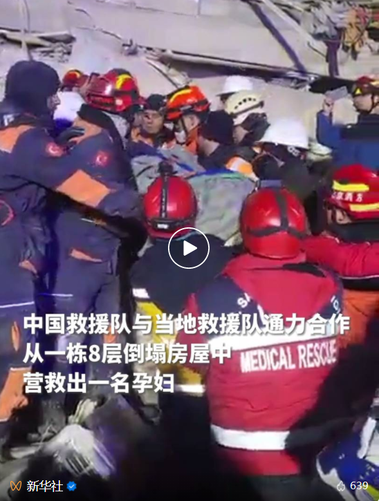 中国救援队副队长赵洋告诉新华社记者,8日下午6时许,土方营救人员联系中国救援队,说在哈塔伊省安塔基亚市一栋8层倒塌房屋的废墟中发现一名孕妇,中国救援队随即到现场进行评估,与土方共同制定营救方案,全程提供专家指导与技术装备支持,双方通力合作,经过数小时艰苦努力,成功营救出被困孕妇。