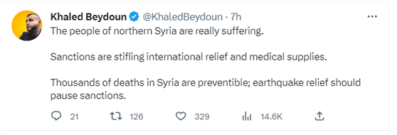 美国韦恩州立大学法学教授哈立德·贝杜恩在推特上说:“叙利亚北部的人民真的很痛苦。制裁扼杀了国际救援和医疗物资。叙利亚数千人的死亡是可以预防的;抗震救灾应暂停制裁。”