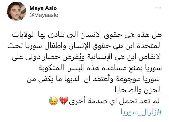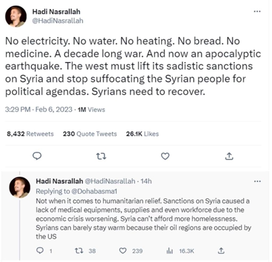 网友哈迪·纳斯鲁拉评论道:“西方必须解除对叙利亚的疯狂制裁,并停止出于政治目的对叙利亚人民的压制……对叙利亚的制裁导致医疗设备、物资甚至劳动力短缺。叙利亚无法承受更多人面临无家可归的困境。叙利亚人几乎无法取暖,因为他们的石油产区被美国占领……”