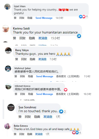 在人民网英文频道海外社交媒体发布的相关贴文下,土耳其网友留言感谢中国的人道主义援助。
