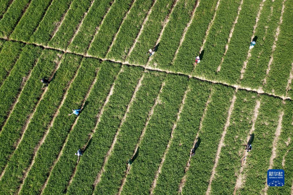 2023年1月31日,村民在浙江省诸暨市同山镇绿剑村的田间护理小麦(无人机照片)。新华社发(郭斌 摄)