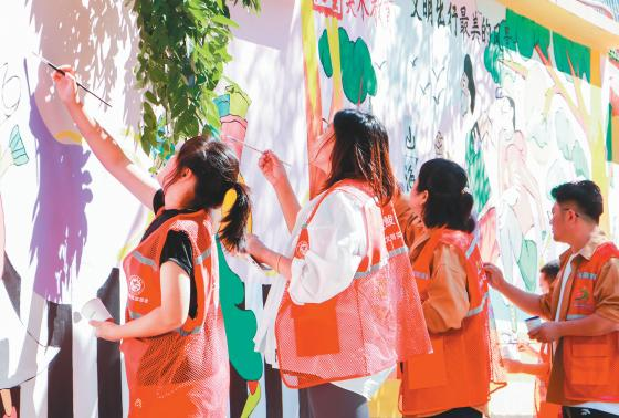 辽宁营口鲅鱼圈学雷锋志愿者手绘文化墙助力创城