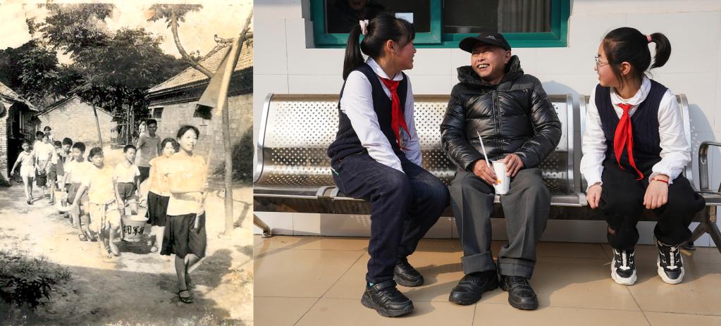 左图:20世纪60年代,金沙小学五(2)雷锋中队队员帮助军烈属打水(新华社发);右图:2023年2月24日,金沙小学学生们和当地敬老院老人聊天(新华社记者 季春鹏 摄)(拼版照片)。