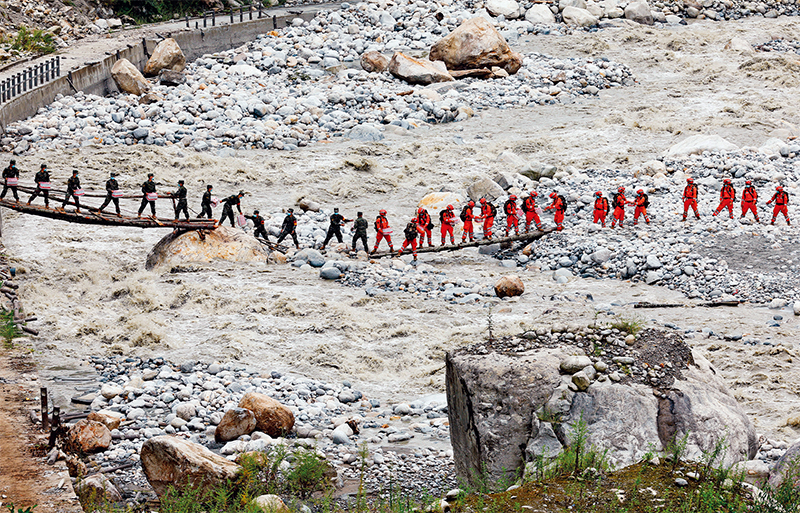 2022年9月5日,四川甘孜藏族自治州泸定县发生6.8级地震,解放军和武警部队官兵、民兵预备役人员驰援灾区展开救援。图为泸定县磨西镇附近,官兵在临时架设的小桥上向河对岸的村民运送生活物资。解放军画报供图 沈伯韩/摄