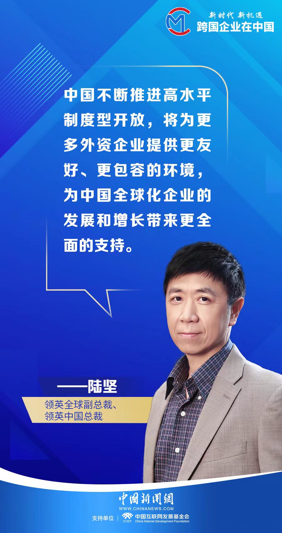 “中国不断推进更高水平制度型开放,将为以领英为代表的更多外资企业提供更友好、更包容的环境,为中国全球化企业的发展和增长带来更全面的支持,包括更广的全球视野共享、更优的全球资源协调,以及更多的全球机会连接。”陆坚称。