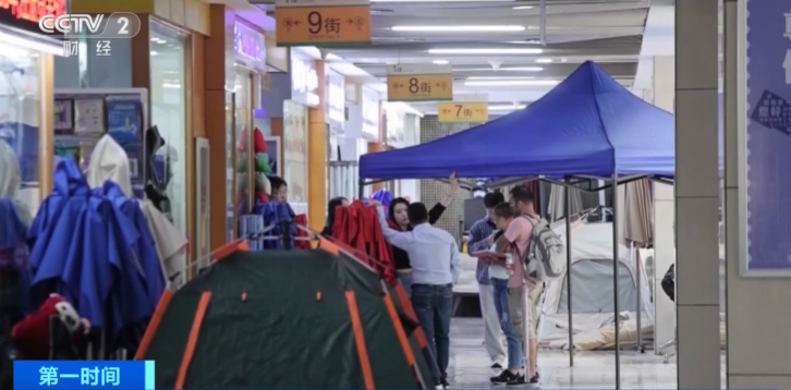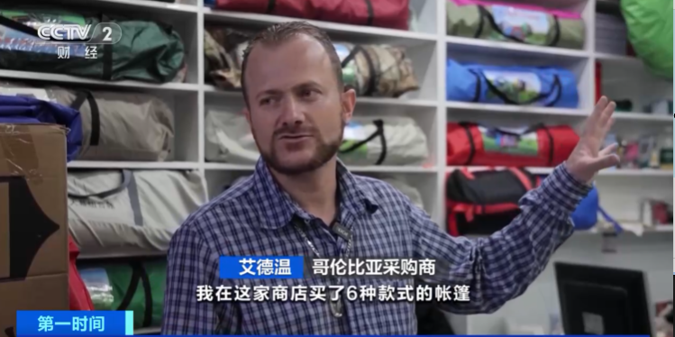 在义乌国际商贸城的一家店铺旁,来自哥伦比亚的艾德温正在挑选不同款式的帐篷,他们这次要采购4—6人,以及6人以上的中大型帐篷。