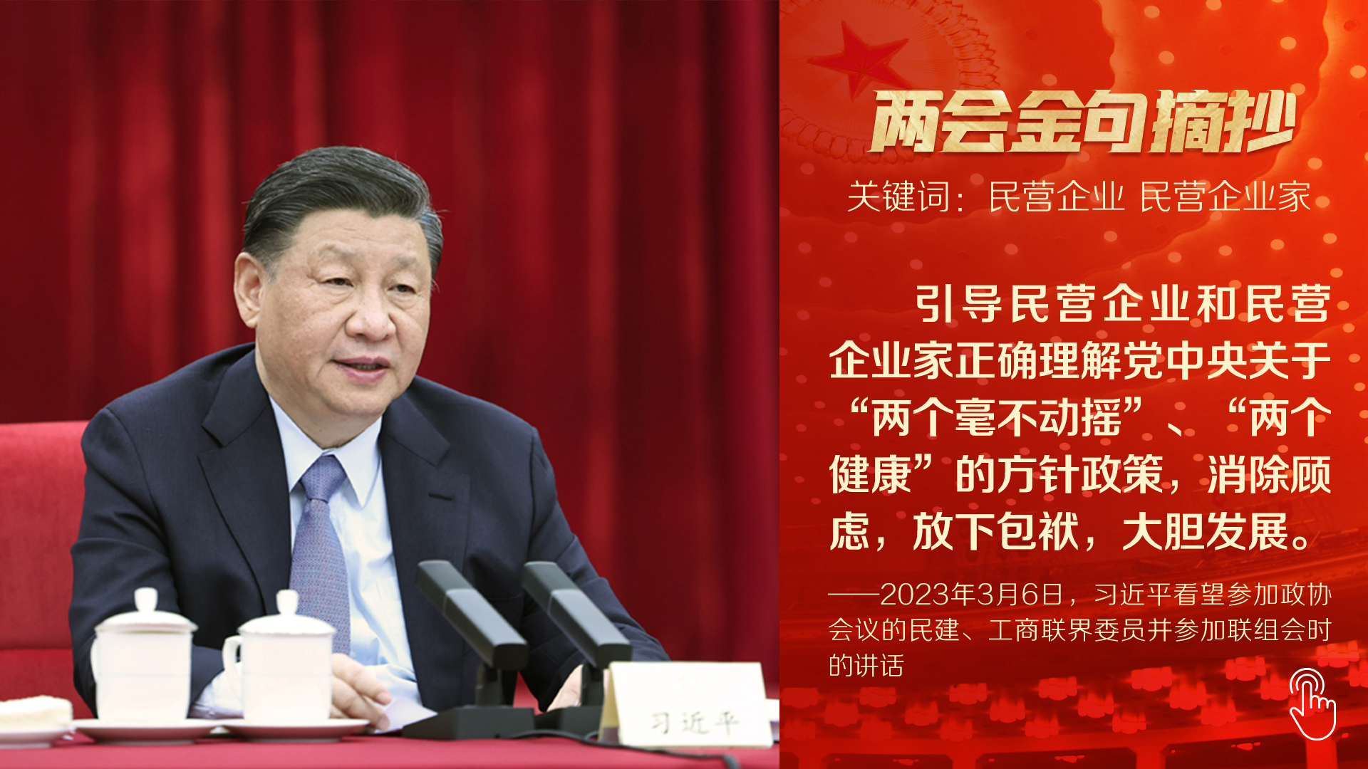“高质量发展是全面建设社会主义现代化国家的首要任务。”今年两会首次到团组,总书记以高质量发展为题,详细阐述中国未来施政发力点。第二天参加民建、工商联界委员联组会,他又就正确引导民营经济健康发展、高质量发展作出重要论述,一句“要坚守主业、做强实业,自觉走高质量发展路子”为全国4700多万家民营企业指明方向。十四届全国人大一次会议闭幕会上,总书记再次向世界宣示:在强国建设、民族复兴的新征程,我们要坚定不移推动高质量发展。