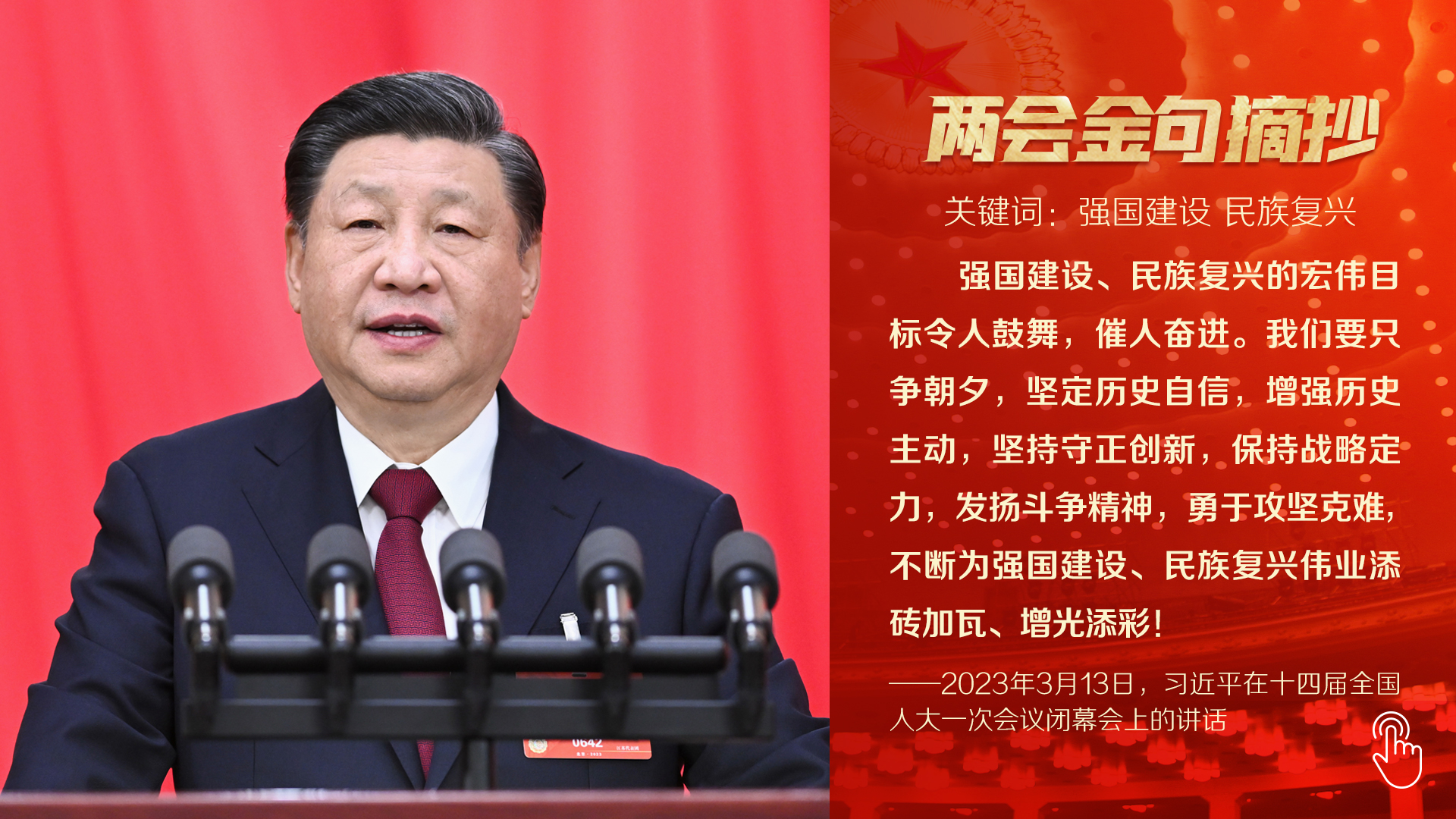 “在新征程上作出无负时代、无负历史、无负人民的业绩,为推进强国建设、民族复兴作出我们这一代人的应有贡献!”2023年全国两会闭幕之际,习近平总书记发出的号召,澎湃人心,催人奋进。
