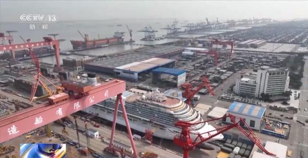中国船舶外高桥造船邮轮办公室主任 大型邮轮工程项目副经理 易国伟:顾客在登船和下船以后,在当地也会进行对应的消费和娱乐,所以对当地港口的母港经济拉动也是比较明显的。中国的邮轮产业如果按照正常的发展速度,预估在2035年可以达到一年5000亿元的产值。