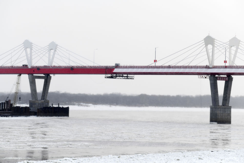 ↑这是中俄首座跨黑龙江公路大桥黑河-布拉戈维申斯克公路桥。这座大桥是两国元首共同关心推动的重大跨境基础设施项目,它的开通在中国东北地区和俄罗斯远东地区之间开辟新的国际运输通道,成为中俄跨境互联互通建设的标志。