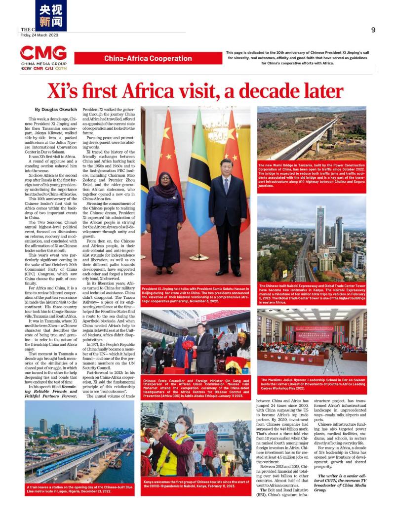 作为“真实亲诚”理念的首倡之地,坦桑尼亚最受欢迎的英文报纸《公民报》与总台非洲总站携手,于3月24日推出纸质和电子版“真实亲诚”主题专刊。非洲资深媒体人撰写文章,回顾习近平主席在2013年提出“真实亲诚”对非政策理念的访非之旅,并阐释“真实亲诚”理念在过去十年中如何引领非中合作达到前所未有的新高度。文章配发多张图片,呈现了位于埃塞俄比亚的非洲疾控中心总部、坦桑尼亚尼雷尔领导力学院、尼日利亚拉各斯轻轨、肯尼亚内罗毕机场快速路等中非合作的重要工程,通过这些代表性案例,展现在“真实亲诚”对非政策理念提出后的十年中非中合作取得的历史性成就。