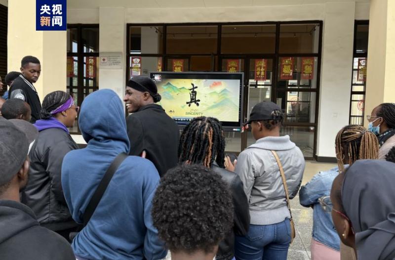 △肯尼亚内罗毕大学孔子学院的校园里,学生们驻足观看总台宣传片。