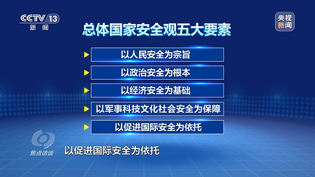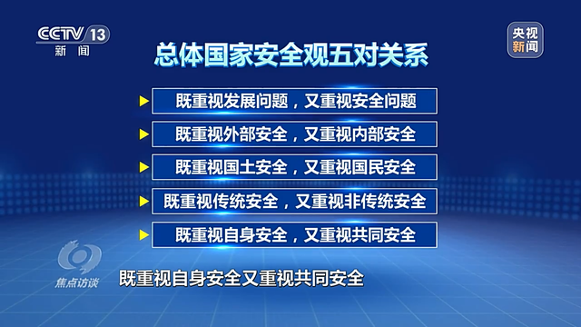 中国社会科学院世界经济与政治研究所副所长 冯维江:总书记提出五大要素五对关系,这是理解总体国家安全观的核心要义。从五大要素来讲,以人民安全为宗旨;以政治安全为根本;以经济安全为基础;以军事科技文化社会安全为保障;以促进国际安全为依托。五对关系是既重视发展问题,又重视安全问题;既重视外部安全,又重视内部安全;既重视国土安全,又重视国民安全;既重视传统安全,又重视非传统安全;既重视自身安全,又重视共同安全。