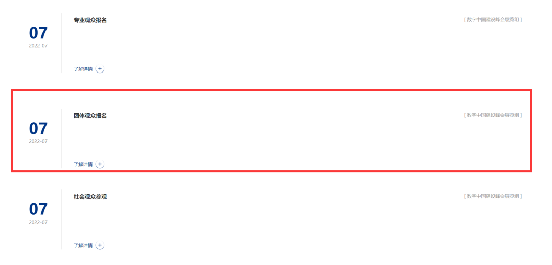 进入数字中国建设峰会官网,点击“观众报名”栏目,选择“团体观众报名”。
