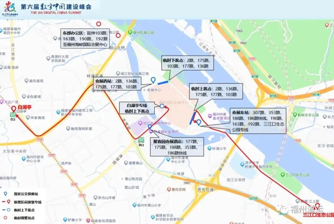 (2)可乘坐三江口生态公园——公交海峡国际会展中心东站区间专线,从三江口生态公园出发沿着南江滨东大道、浦下洲路、会展东路至公交海峡国际会展中心东站。