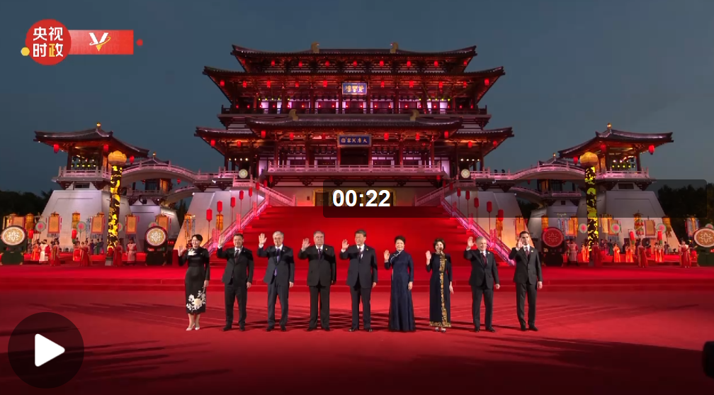 国家主席习近平和夫人彭丽媛5月18日晚在西安大唐芙蓉园举行仪式,欢迎出席中国-中亚峰会的中亚五国领导人和夫人并集体合影。
