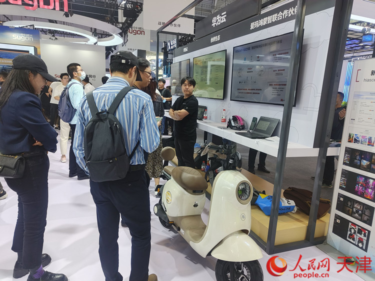 会场上,几位参观者驻足在爱玛刚刚发布的智能产品前,细细观看。人民网记者 孙翼飞摄