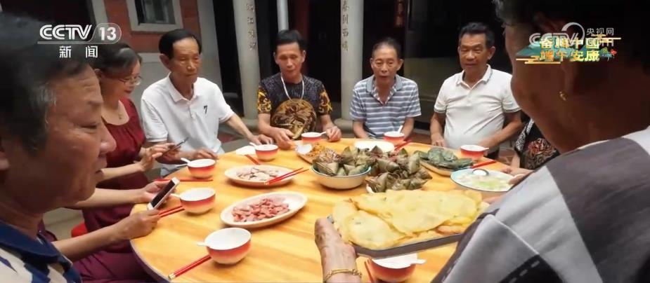 在福建晋江,大家围炉而坐,正在品尝端午小吃“煎堆”,古时称为“煎?”,是饼状面食。在福建晋江民间,流传着“煎堆”补天的说法。古时,当地居民耕海牧田,端午前后常常阴雨连绵,盼晴心切的人们想出端午节吃“煎堆”的妙招,祈愿天快放晴。清代乾隆版《泉州府志》卷二十记载:“以米粉或面和物于油内煎之。” 将糯米粉、麦粉和白糖、清水混合,大火煎烤,是一份独特的端午记忆,也传承了古时端午的味道。