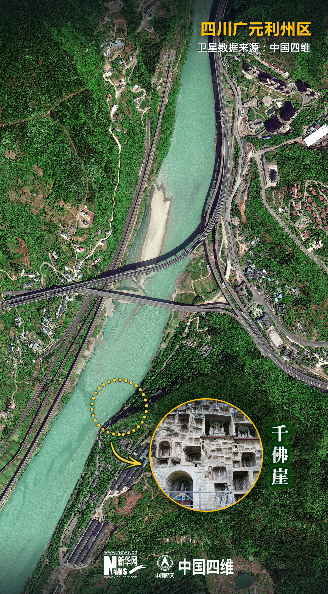 值得关注的是,就在千佛崖的河对岸,几条现代化交通网错落有致地交织在一起。今日的广元是名副其实的“交通博物馆”。老川陕路、京昆高速、宝成铁路、西成高铁、嘉陵江航道在这里交织“奔腾”。横渡嘉陵江,仿佛穿越古今。