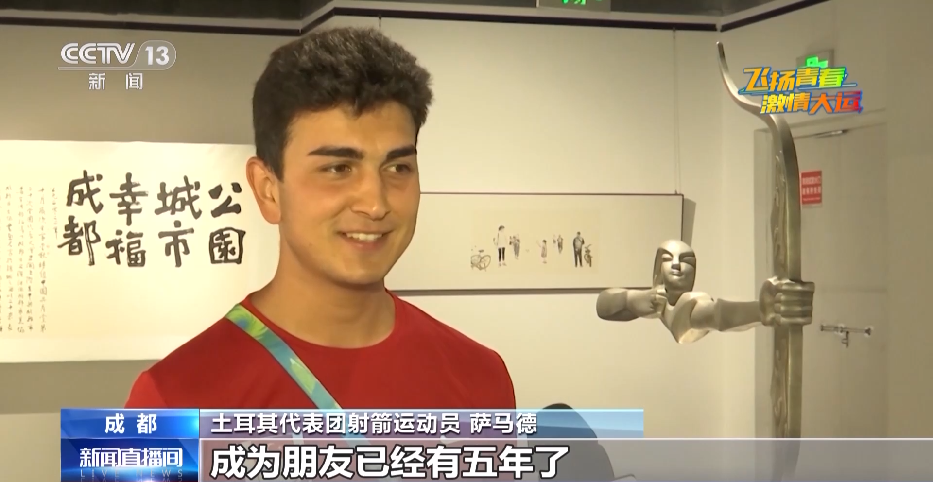 土耳其代表团射箭运动员 萨马德:成为朋友已经有五年了。之前我不知道他也会来大运会。射箭比赛第一天,在赛场看到他,真的非常惊喜。