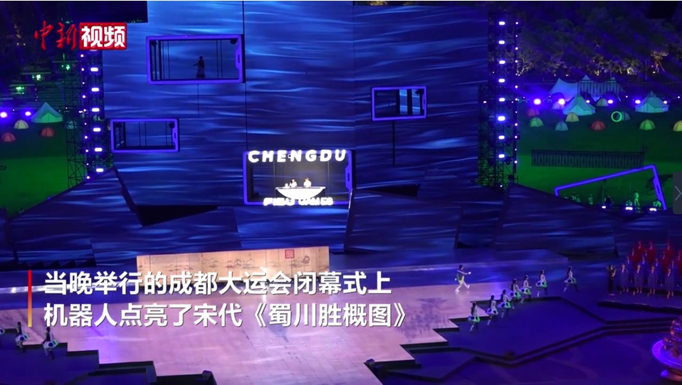 8月8日晚举行的成都大运会闭幕式上,机器人点亮了宋代《蜀川胜概图》。《蜀川胜概图》是宋代著名绘画艺术珍品,画卷所绘内容为宋代川峡四路(今四川、重庆)的著名山岳、河流、城池风貌,且对宋代的地理名称有详细标注,在具有很高艺术价值的同时,兼具很高的历史研究价值。