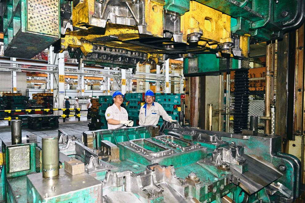 图为冯斌(左)检查冲压机床工作状态。新华社记者许畅 摄