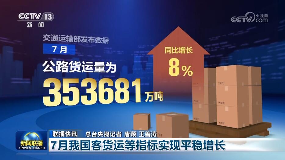 353681万吨。交通运输部发布数据,7月,公路货运量为353681万吨,同比增长8%;水路货运量为78964万吨,同比增长6.9%。客运方面,7月公路客运量为40798万人,同比增长19.3%;水路客运量为3034万人,同比增长78.3%。