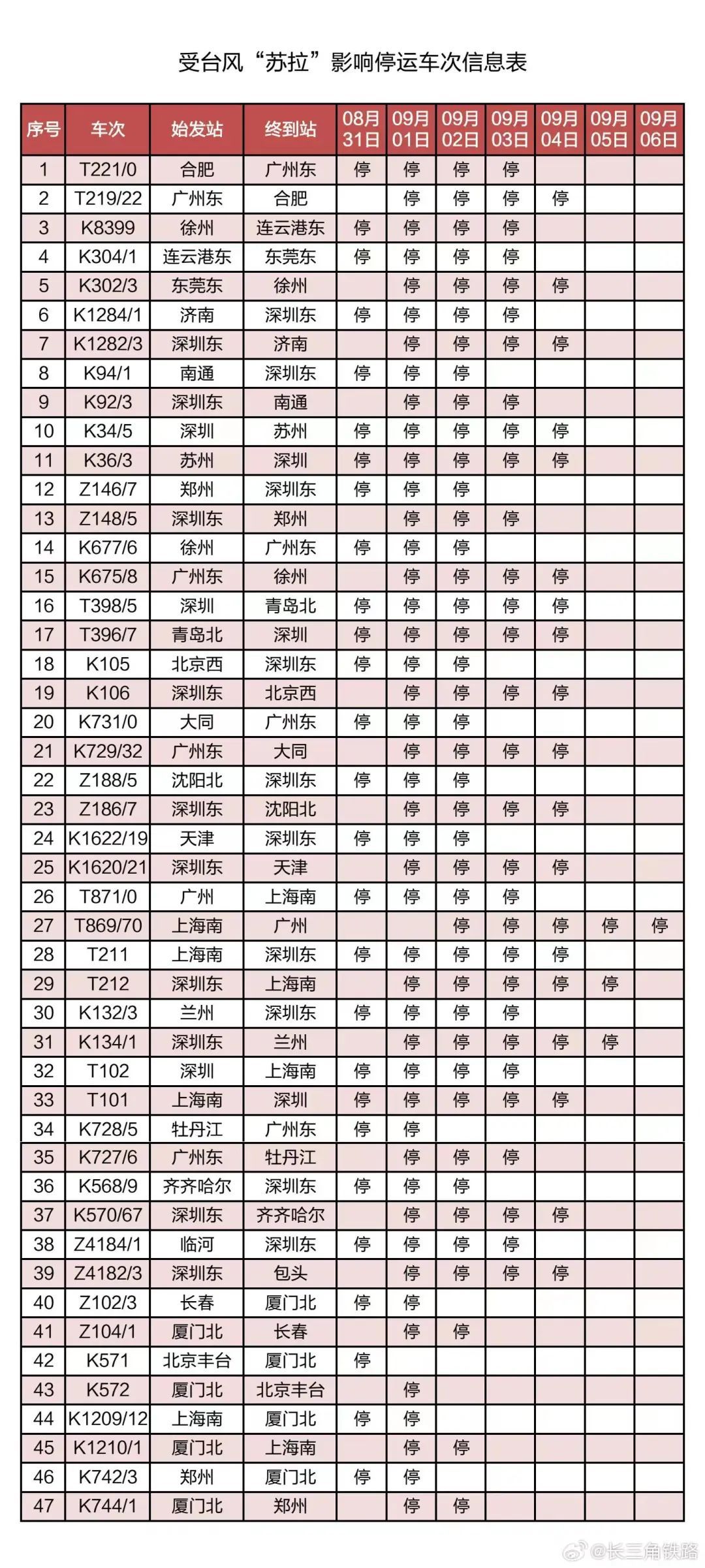 据中国铁路上海局集团公司消息,受第9号台风“苏拉”影响,为确保列车运行安全,铁路部门计划对杭深线、京港高铁、广深城际、广深港高铁、穗深城际、京九线等线路运行的部分列车采取停运措施。截至30日17时30分,计划停运8月31日至9月6日间共121趟旅客列车:其中停运动车组列车74趟,停运普速列车47趟。