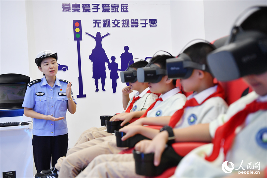 人民网南昌8月31日电(记者时雨)31日,江西省南昌市珠市学校万寿宫校区将“开学第一课”搬进南昌市公安交通治理体验中心,大家戴上VR眼镜,通过动感仿真平台,体验各种不同交通场景。