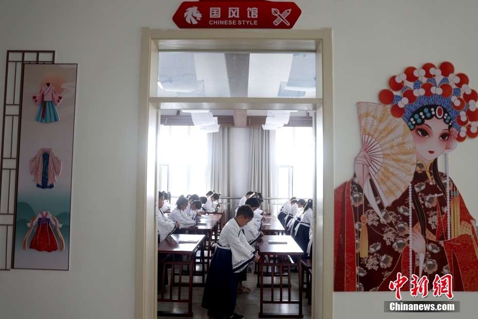 9月7日,甬库振兴村,孩子们身着汉服学习“三字经”及传统礼仪。